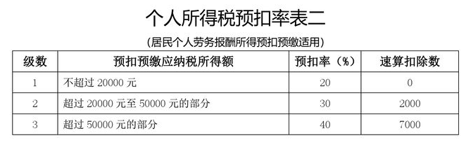 勞務(wù)報酬所得適用20%至40%的超額累進預扣率(見《個人所得稅預扣率表二》)。